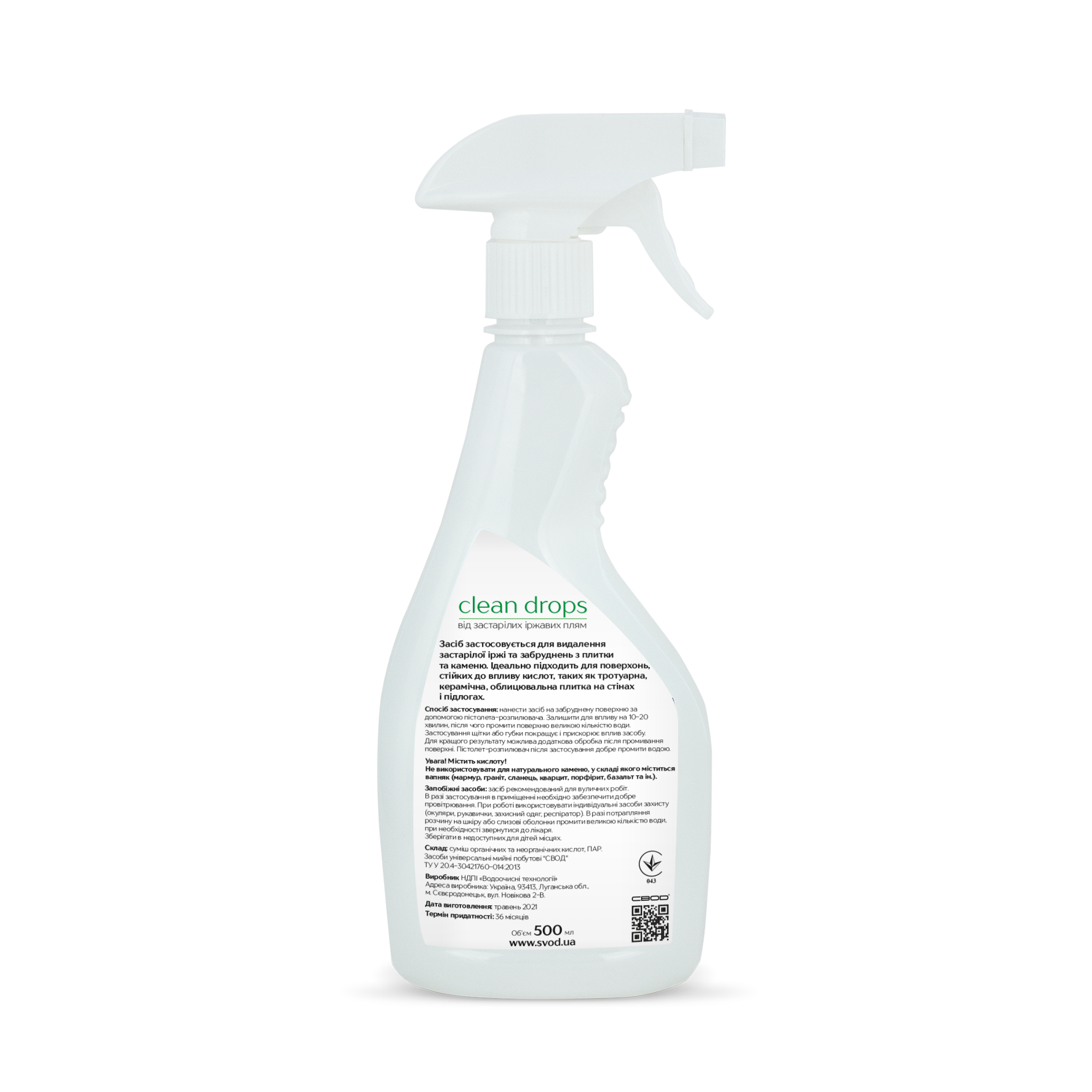 Средство "Clean drops" применяется для удаления застарелой ржавчины и загрязнений с плитки и камня. Идеально подходит для поверхностей, устойчивых к воздействию кислот, таких как тротуарная, керамическая, облицовочная плитка на стенах и полах.